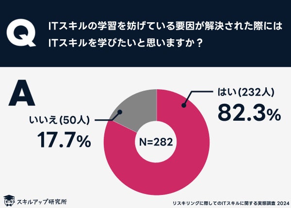 他分野でリスキリングを経験した人に対して、ITスキルの学習意欲を尋ねたところ、82.3%が「はい」と回答した。ITへの関心は非常に高いことがわかる。