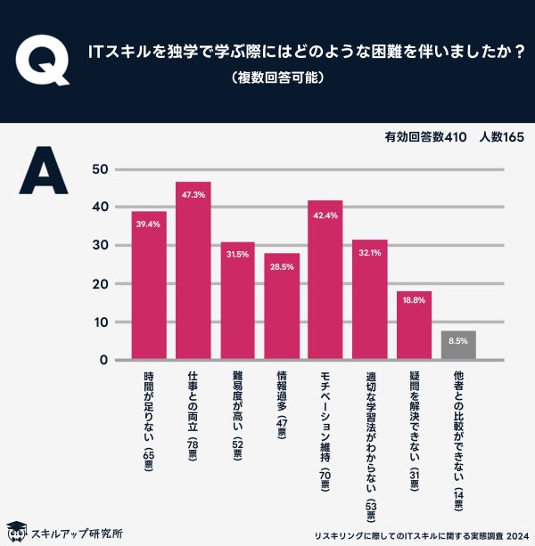 ITスキルの独学における最大の困難は、「仕事との両立」であり、回答した人は47.3%と最多となっている。また、「時間が足りない」(39.4%)、「モチベーション維持」(42.4%)も上位に挙げられており、社会人が本業の合間を縫ってITスキル習得に取り組むことの難しさが窺える。