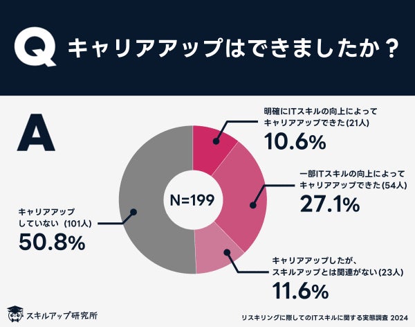 また、明確にITスキルの向上によってキャリアアップできた」と答えた人は10.6%にすぎず、「一部影響があった」とする回答も27.1%と3割に満たなかった。約6割の人が、「キャリアアップしていない」(50.8%)または「キャリアアップしたがスキルアップとは関連がない」(11.6%)と回答している。