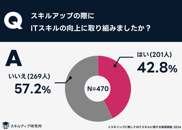 スキルアップの際にITスキルの向上に取り組んだかという質問には、「はい」と回答した人は42.8%、「いいえ」と回答した人は57.2%だった。