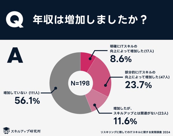 実際に年収が増加したかを尋ねたところ、「明確にITスキルの向上によって増加した」は8.6%にとどまり、「部分的に増加した」とする人も23.7%にすぎなかった。一方で、「増加していない」「増加したが、スキルアップとは関連がない」と回答したのは計7割弱にのぼった。