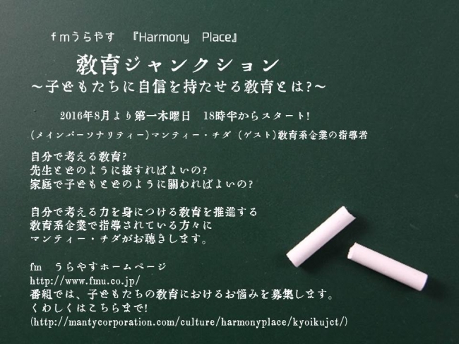 ラジオ番組制作事業を展開するマンティーコーポレーション(所在地:東京都品川区 代表:千田 靖呂)は、2016年8月4日(木)より毎月第一木曜日、fmうらやす『Harmony Place』にて、「子どもたちに自信を持たせる教育とは?」をテーマにした新番組~教育ジャンクション~の放送を開始いたします。番組では、子どもが社会に出てからも、自分で考え行動ができるようになるための教育について、学研教室の先生からお話を伺い、夏休みの過ごし方や新学期に向けての心構えなど、その時々のテーマに合った内容でお届けします。ご家族みんなでお楽しみください。