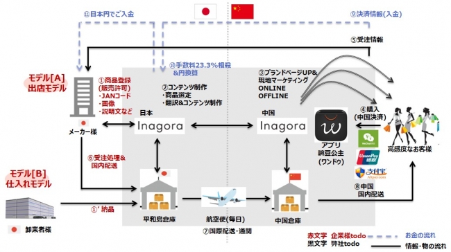 日本の事業者と中国の消費者を直接結ぶB to B to Cの越境ECプラットフォームです。インアゴーラの運営チームが、翻訳、物流、決済、マーケティング、顧客対応などの全作業を代行するため、日本の事業者は日本の倉庫に商品を発送するだけで、巨大な中国市場に進出することができます。また、日本の事業者と中国人ユーザー双方の様々な需要を柔軟に汲みとるために、「出店」「仕入れ」「独占販売」全ての形態を採用している点も特徴です。