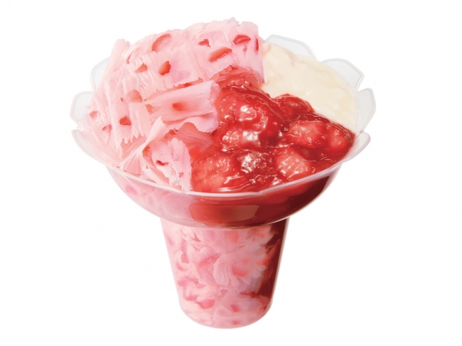 ミルク風味のアイスを薄くスライスし、果肉入りストロベリーソースをトッピングしました。