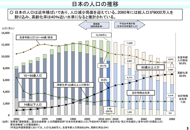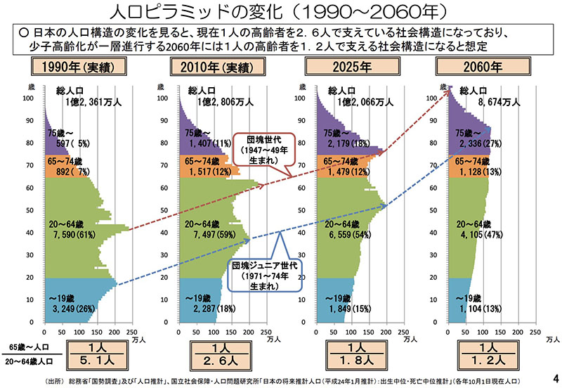 高齢者人口の増加と、同時に進む少子化によって、現役世代(15~64歳)が急速に減少。その結果、労働力不足・医療体制の逼迫・社会保障制度の限界など、幅広い社会課題が表面化することが懸念されています。