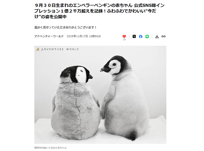 参考:9月30日生まれのエンペラーペンギンの赤ちゃん 公式SNS総インプレッション1億2千万超えを記録!ふわふわでかわいい“今だけ”の姿を公開中