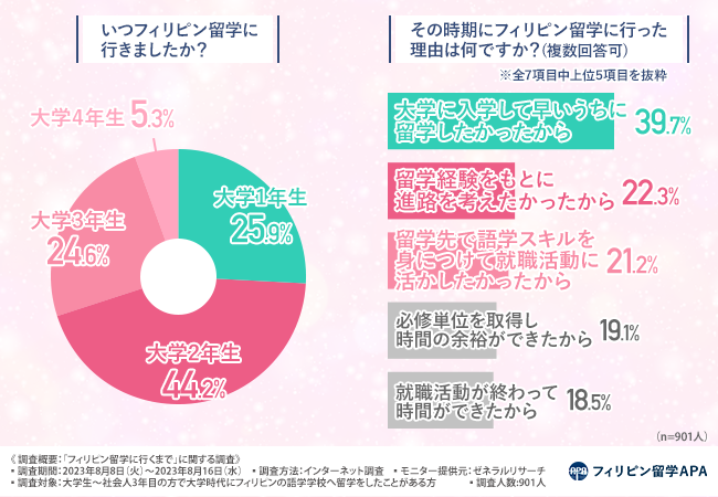 フィリピン留学経験者のおよそ半数が“費用の安さ”を理由に留学先を選んだと回答!約7割が大学2年生まで…