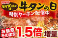 9月10日は牛タンの日!上タン塩ほか人気お肉の1.5倍増量クーポン配信!