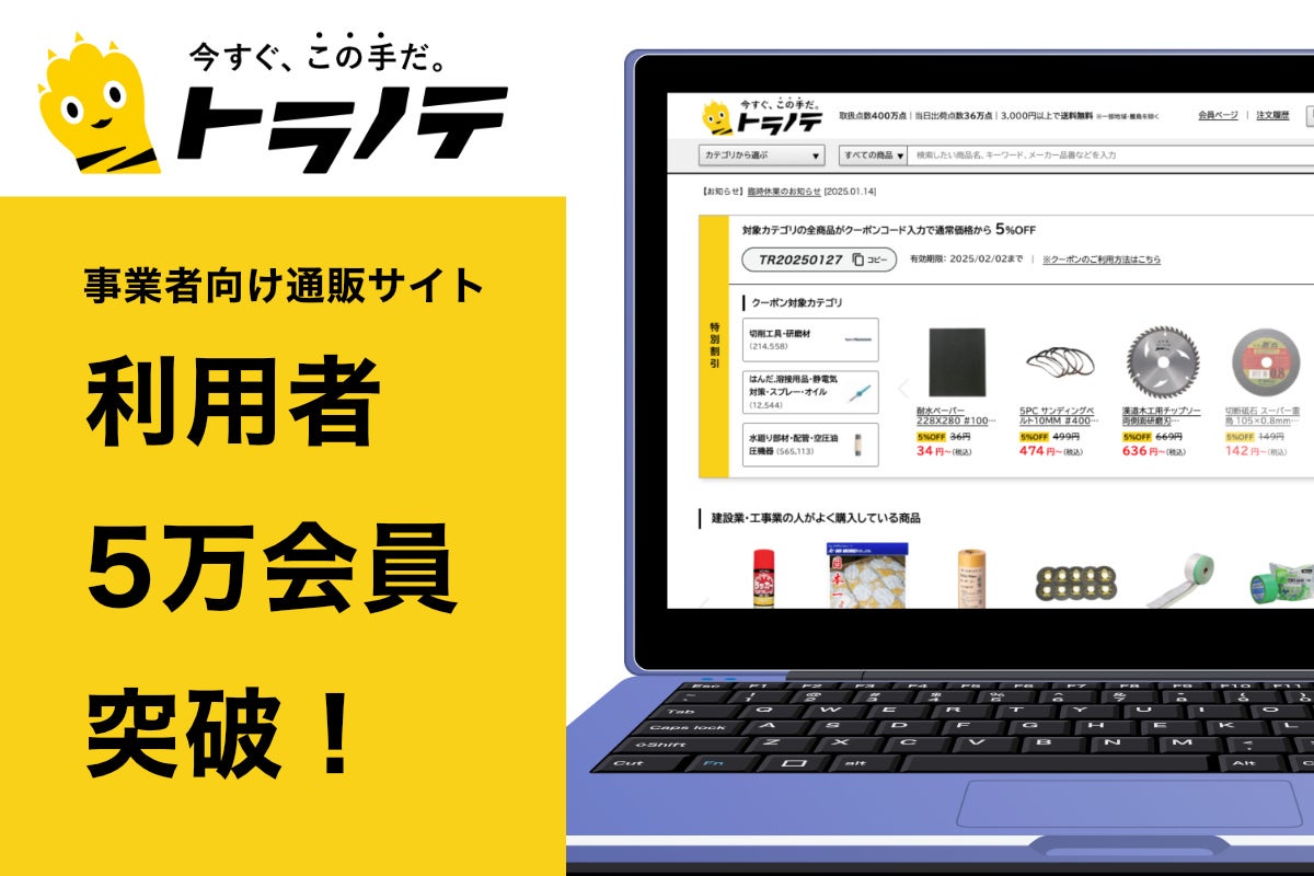 【建築・建設・製造業の資材調達を支援】「トラノテ」利用数5万会員突破!工具および資材を取り扱う事業者…