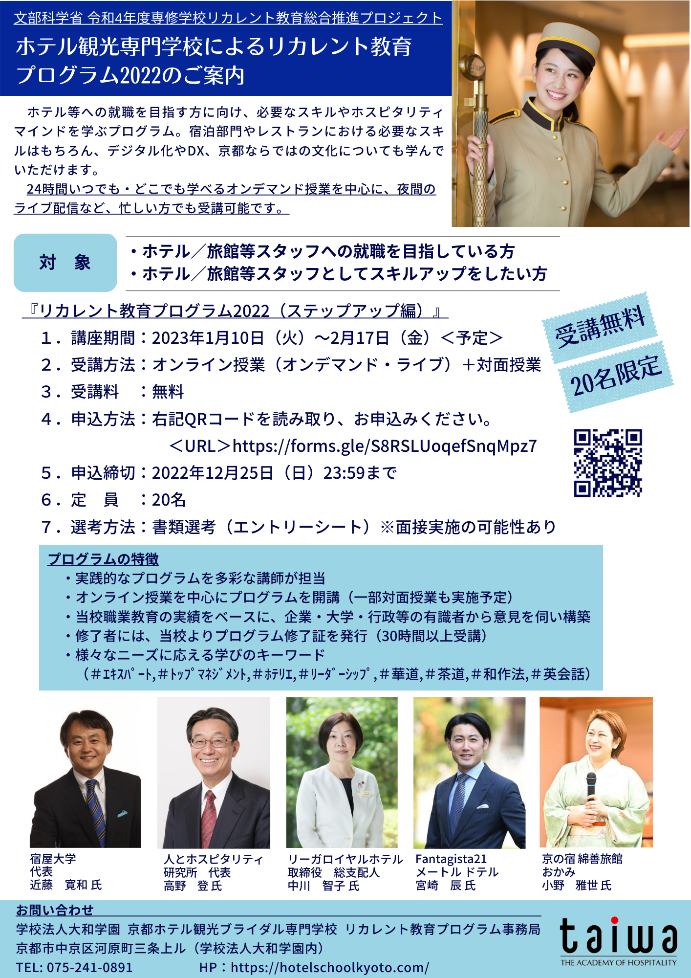 コロナ禍で生じた観光人材不足に対応!京都のホテル専門学校が社会人学び直しリカレント教育プログラムを発…