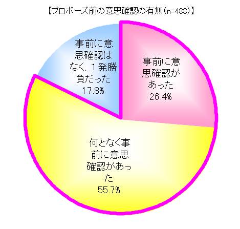 意外とわからない皆さんのプロポーズについて聞いてみたところ、「事前に意思確認があった」女性は26.4%、「なんとなく事前に意思確認があった」女性は55.7%という結果になり、80%以上の女性が男性から事前確認をされていたようです。