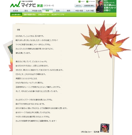 派遣情報サイト『マイナビ派遣』よりお仕事応募で石川遼から応援メッセージが届く!