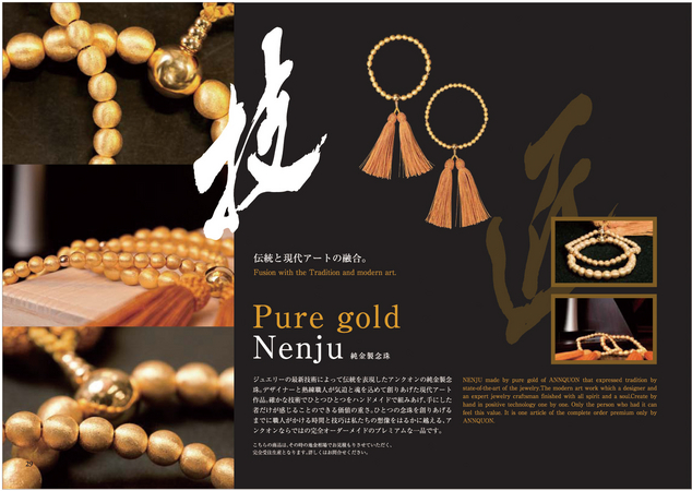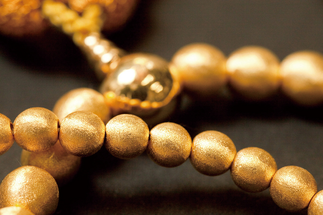 ジュエリー製作の技術によって、伝統を表現したアンクオンの純金製の数珠。熟練職人が気迫と魂を込めて創りあげた現代アート作品。確かな技術でひとつひとつをハンドメイドで組み上げ、手にした者だけが感じることのできる価値の重さ。ひとつの数珠を創りあげるまでに職人がかける時間と技巧は想像をはるかに超える。