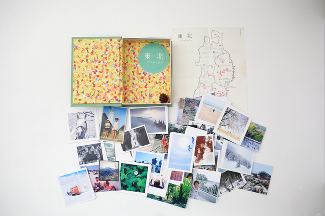 「aromamora books vol1 東北」は、東日本大震災によって震災前の東北地方の景色や思い出を風化させない事を目的として制作されました。写真集は、震災前後の東北の写真をウェブで一般公募し、集まった約500 枚の写真の中から厳選された50 枚で制作されたものです。アルバムの形をしたボックスに、写真と「aromamora &01 Tohoku」の香り付きコースターが同梱され、写真をめくるたびに東北の森の香りが漂う写真集になっています。香りが消えた場合の補充用に1.5ml のアロマオイルが入ったミニボトル付きです。アロマの香りがする写真集は史上初の試みです。
