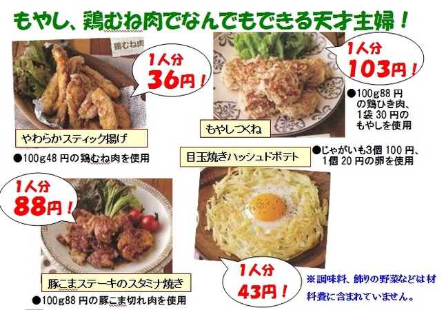 ※「お得スター食材」とは、鶏むね肉、豚こま切れ肉、豆腐、卵、もやし、卵など安く手に入る食材のこと。