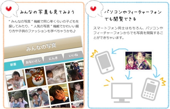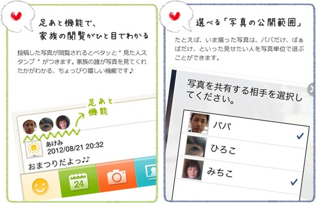 さらに、PCやフィーチャーフォンからでも写真を閲覧できるため、スマートフォンをお持ちでない方にも子供の写真を届けることができます。また、投稿した写真を家族が閲覧すると、写真に「足あと」がつく機能があるため、家族が見守ってくれていることを意識しながら、子供の成長を記録していくことができます。
