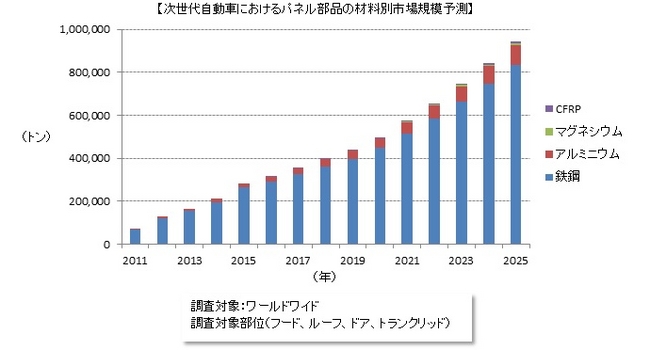 次世代自動車に採用されるアルミボディパネルは2025年には現在の8倍の約9.5万トン CFRPも約1.0万トンの採用規模に急成長!