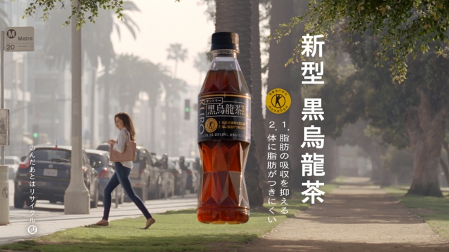 新CMでは、スタイリッシュなデザインの新オリジナルボトルへと生まれ変わった新型「黒烏龍茶」を