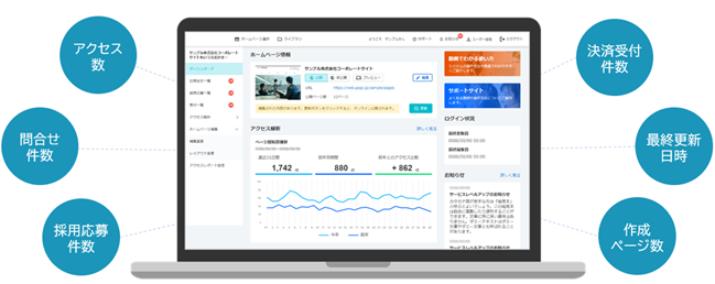 ホームページの成果が分かるダッシュボード画面、ホームページ成果レポートの提供をはじめ、より効果を実感していただけるサービスを強化し、中小企業・個人事業主の皆様のホームページ活用を促進してまいります。