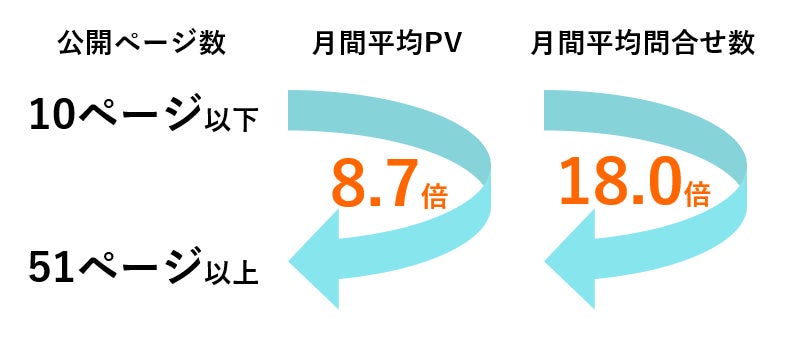 提供実績3万サイト・30万ページを分析した結果、公開ページ数が多いほどPV・問合せ数が多い傾向にあることが分かりました。