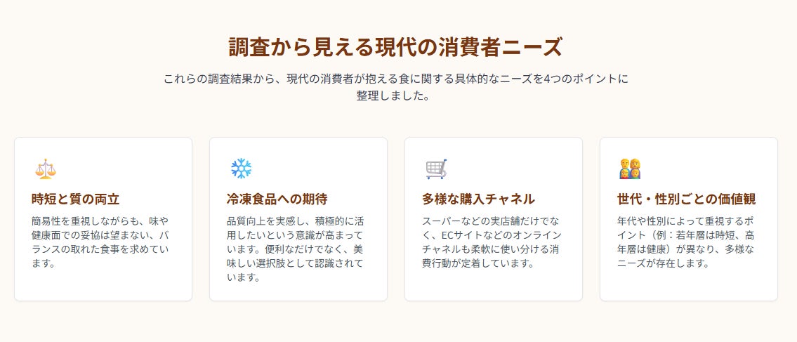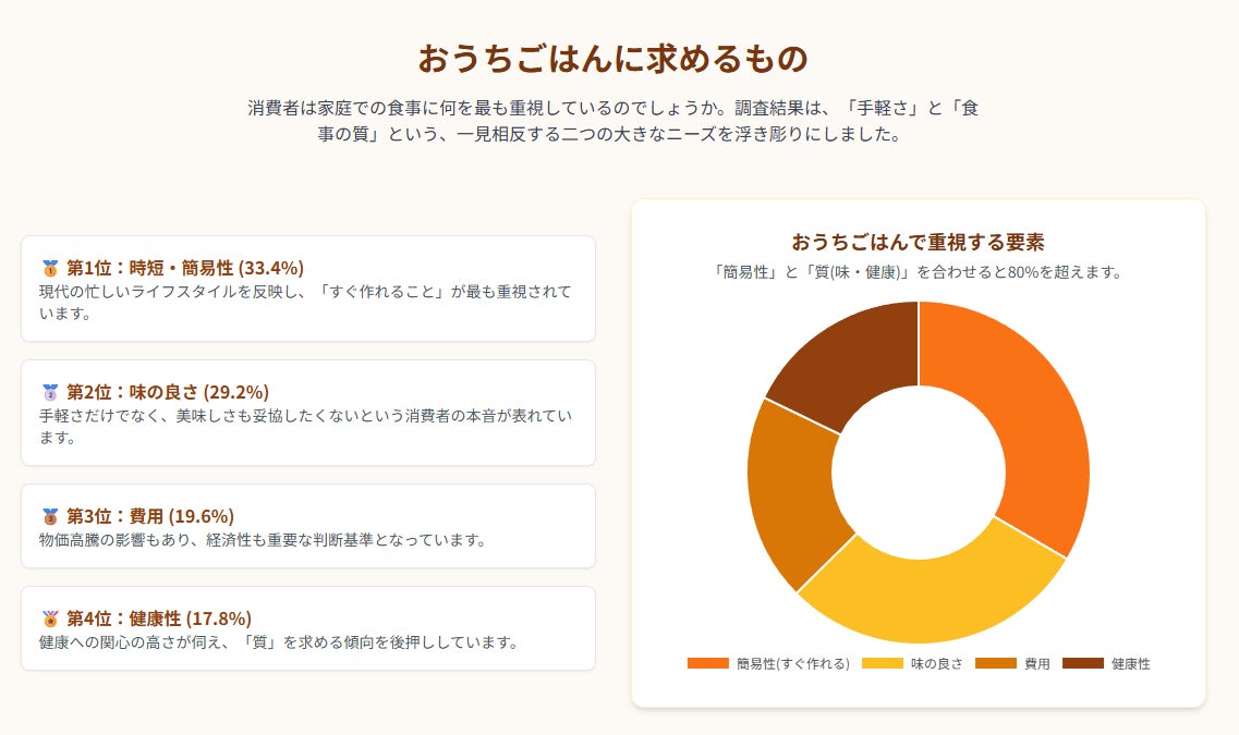 時短と質の両立: 簡易性を重視しながらも、味や健康面での妥協は望まない