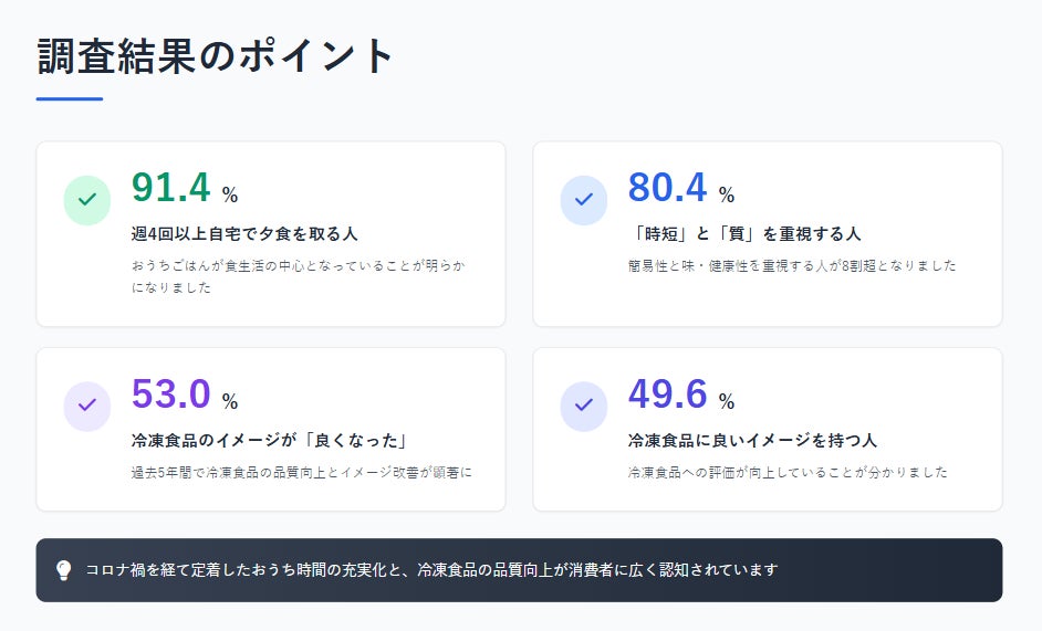 これらの結果は、コロナ禍を経て定着したおうち時間の充実化と、冷凍食品の品質向上が消 費者に広く認知されていることを示しています。