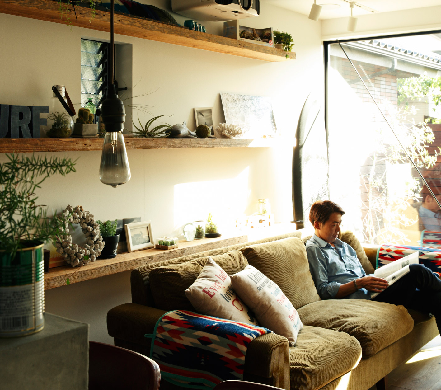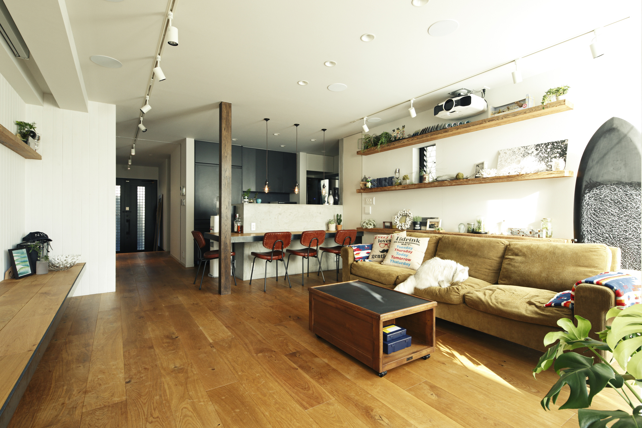 サーフィンがお好きだというお施主さま。家族でくつろげるように、物置となっていた和室を取り込み、LDKを拡大しました。暗かったLDKに自然光がたっぷりと注ぐように、リビングに窓を大きく開口。夏のさわやかな海の家を思わせる白の羽目板の壁。ヨーロピアンオーク、古材、黒皮鉄、モルタルなど、くつろいだ感じの素材を使ったリノベーションで、西海岸を感じる空間に生まれ変わりました。履き込んでクタクタになったジーンズのように暮らしになじむ、カリフォルニアスタイルの住まいです。