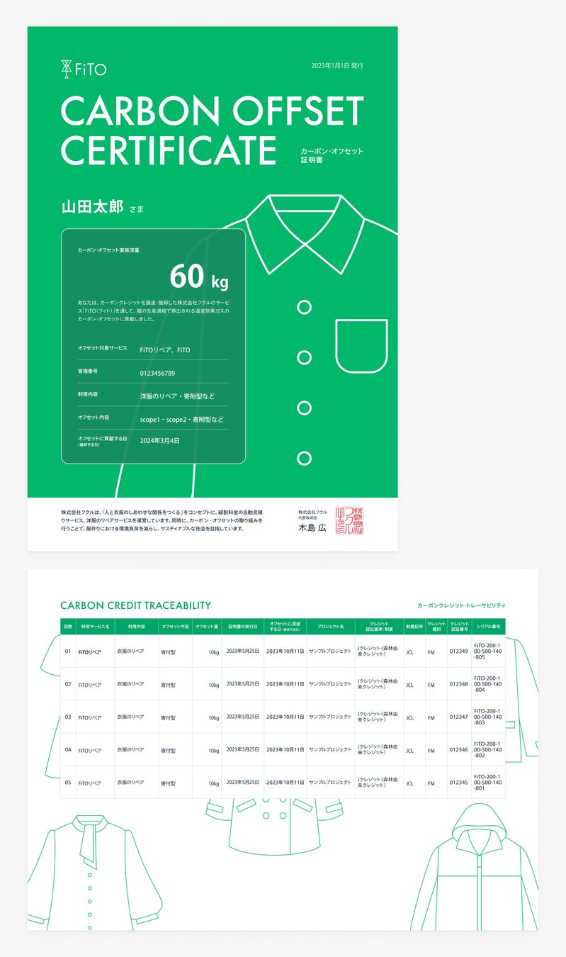 衣服生産・リペアなどでオフセットされた内容を証明書として、受注毎に発行いたします。