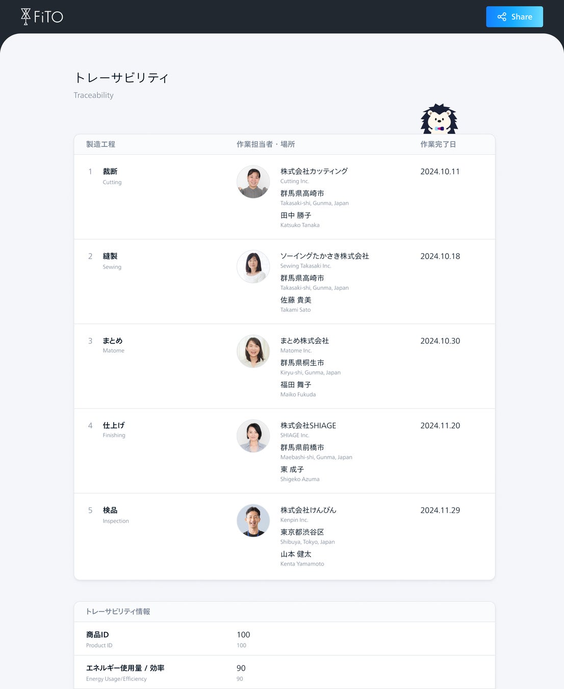 FiTOは、消費者と働く人々の【安心・安全】を見える化することのできるトレーサビリティ機能を提供いたします。いつ・どこで・誰が・どのように・使用材料や消費エネルギー以外にも修理の可能性や補修事業者へのアクセスなど、生産者と消費者をつなぐ架け橋となる情報の公開をサポートします。