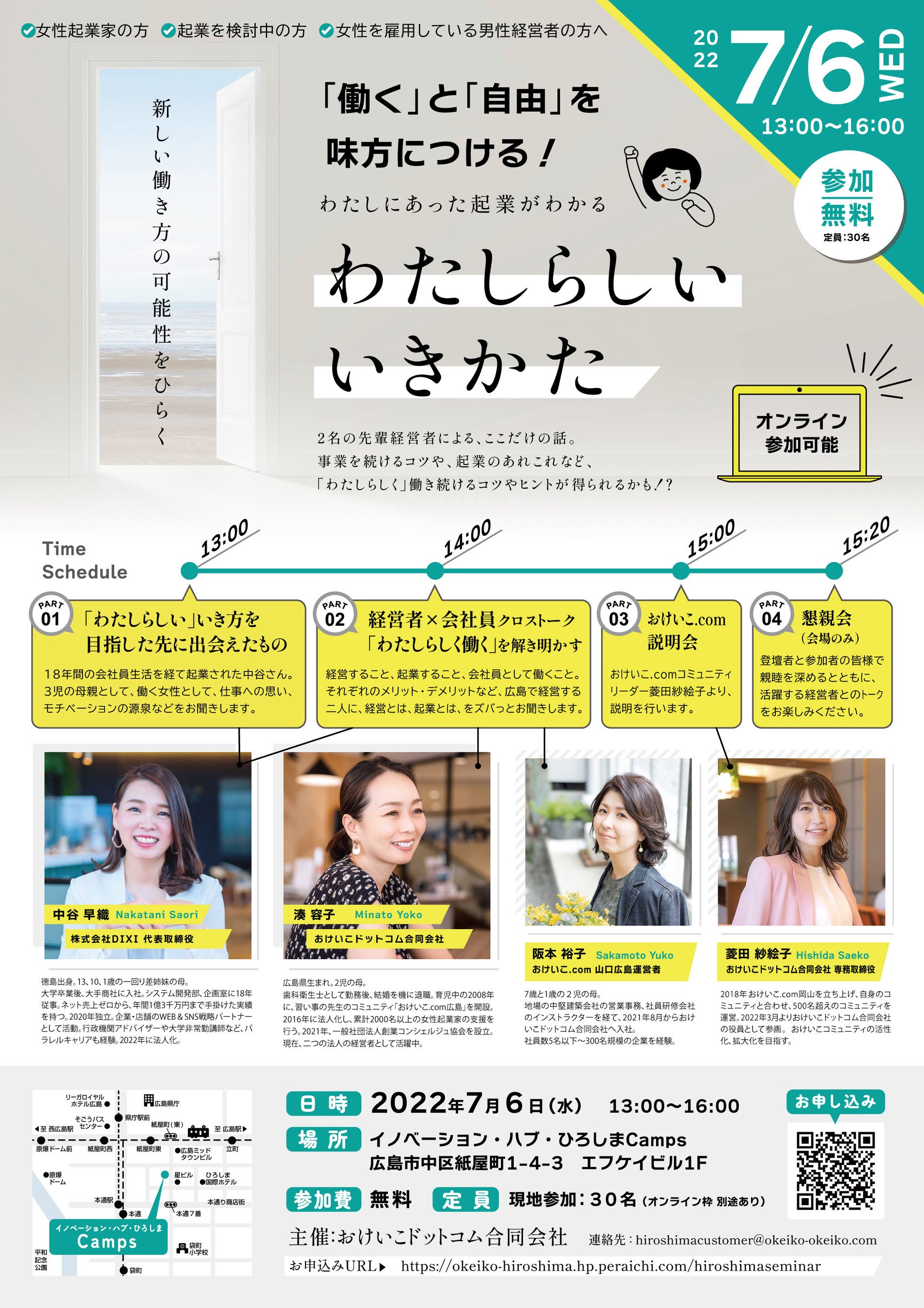 この度、2022年7月6日(水)13:00~15:20 広島市中区にあるイノベーション・ハブ・ひろしまCampsにて、女性に向けて、“起業”をテーマにトークイベントを行います。トークイベントでは、広島で活躍する女性経営者を招き、彼女たちが起業した経緯、企業から経営者となった理由、仕事を継続するために維持しているモチベーション方法など、「自分らしい」いきかたのコツを解明します。