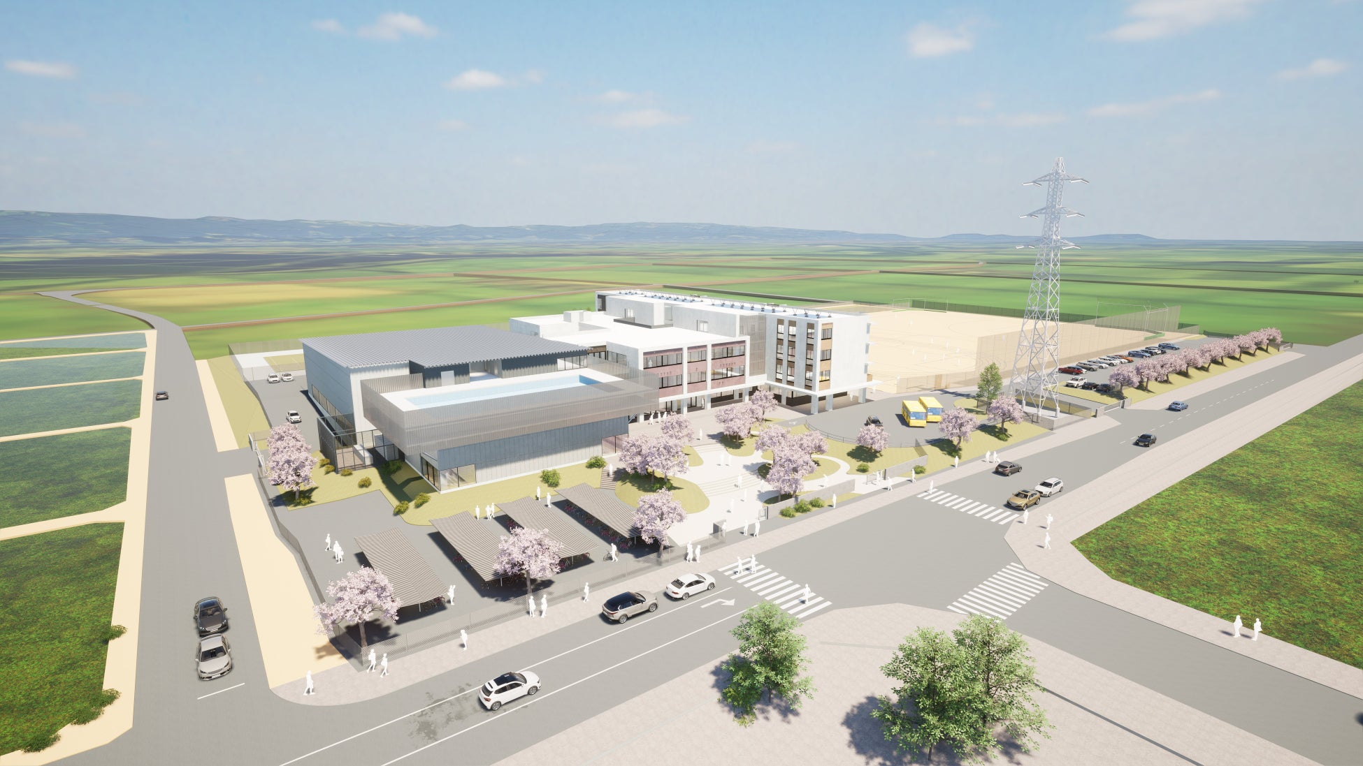 推奨カット:みさとホール全景、校舎外観と来場者の導線。