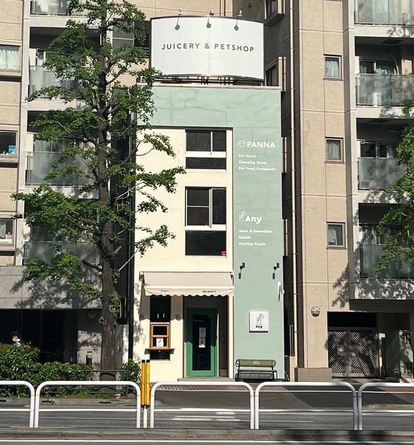 トリミングサロン&ペットホテル「DOGS LIFE PANNA」を経営し15年、ワンちゃんたちが可愛く健康で過ごせるようにサポートしてきて気づいたのは、具合が悪い時、そして最期を迎える時、摂取できるのは水分だということでした。人間も同様に赤ちゃんの時にはミルクを飲み、食事ができない時はスープや野菜ジュース、栄養ドリンクで体力を維持し、最終的に体内に必要なものは水分なのです。そこでドッグフード製作で培った膨大な栄養についての知識をジュースという形にしてお伝えしたい、1日1回「Any」のジュースで元気になって欲しい……、そんな願いを込めて「Anytime(いつでも)」「Anyone(だれでも)」「Anything(なんでも)」「Anywhere(どこでも)」をコンセプトに「Any」が誕生しました。アースカラーとベジタブルカラーで彩られた店内は自然を感じさせ、気分もリフレッシュ! ワンちゃんとお散歩がてら、ランニングやジムの後になども、気軽にお立ち寄りいただけます。