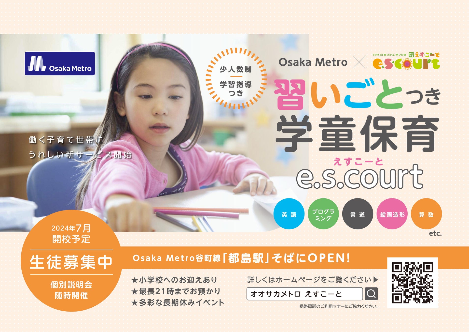 民間学童保育「えすこーと」を運営する株式会社Sene-Gは、大阪市高速電気軌道株式会社(Osaka Metro)と業務提携し、2024 年 7 月に Osaka Metro 谷町線都島駅近くで習いごとつき学童保育をスタートします。