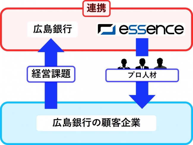本提携は、広島銀行の顧客に対して、エッセンスの「プロパートナーズ」サービスに登録している人材をご紹介し、その知見を活用していただくことで、経営・事業支援を行うものです。
