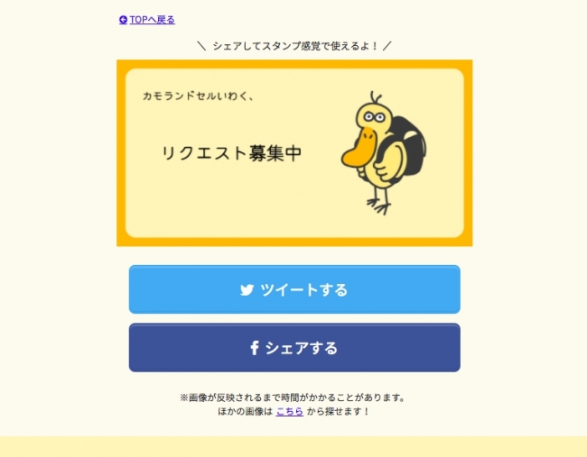「KAMORANDSEL」は、明快なコンセプトと設計のもと作成されました。利用方法はサイトにアクセスし、好きなスタンプ(画像)を選び、TwitterもしくはFacebookでシェアするだけで完了します。ページ遷移はわずか1ページのため、いつでも気軽に利用することができます。