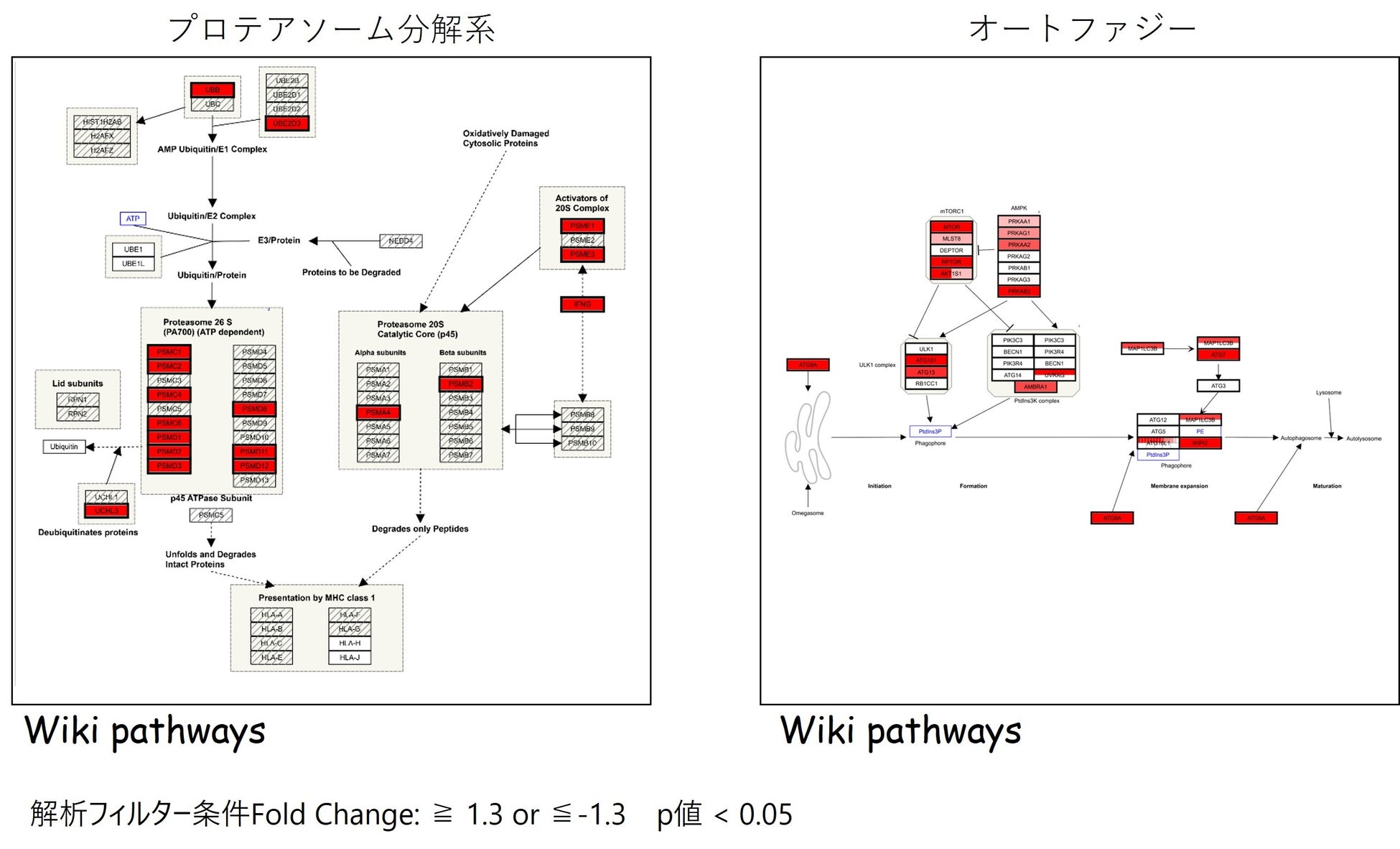 プラセボ群に対してサケ白子抽出物を摂取した被験者で1.3倍以上の遺伝子発現量の増加が認められた遺伝子を赤色でハイライトしています。
