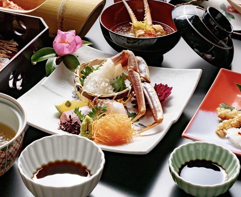 先付/日本海のお造り(蟹刺し入り)/背甲がにグラタン/茹でがに/カニの天ぷら/越前おろしそば/甘味