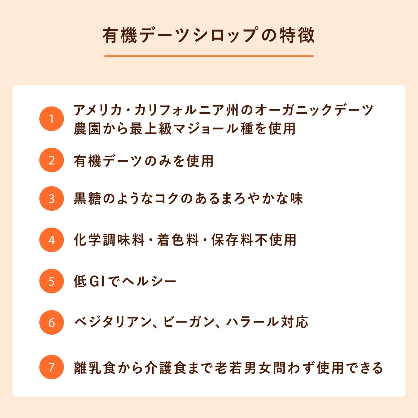 サンセットデーツはUSDA認証を受けたオーガニック(有機)デーツを使用しています。保存料、香料、着色料不使用の完全無添加なシロップです。JAS認証も取得しています。