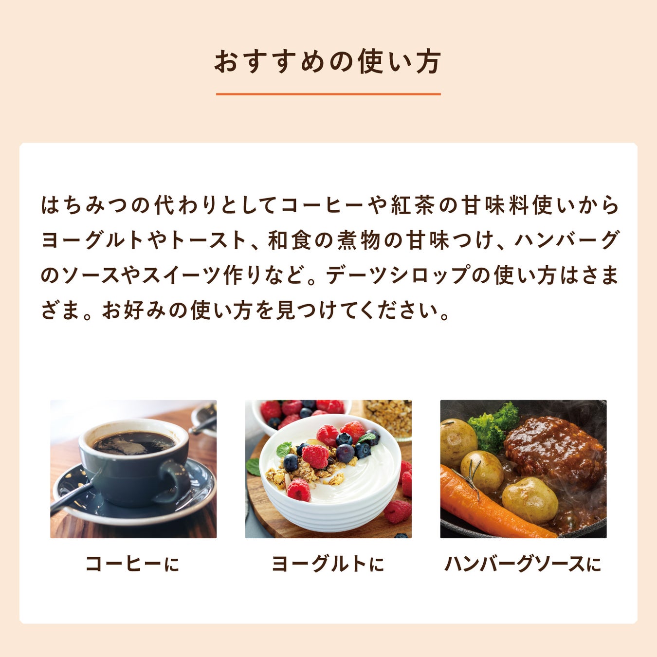 好きな分だけ使えて便利なデーツシロップ。1日の栄養補給にそのまま食べても◎。 はちみつやメイプルシロップと同じようにヨーグルトやトースト、パンケーキなどにかけるのもおすすめです。