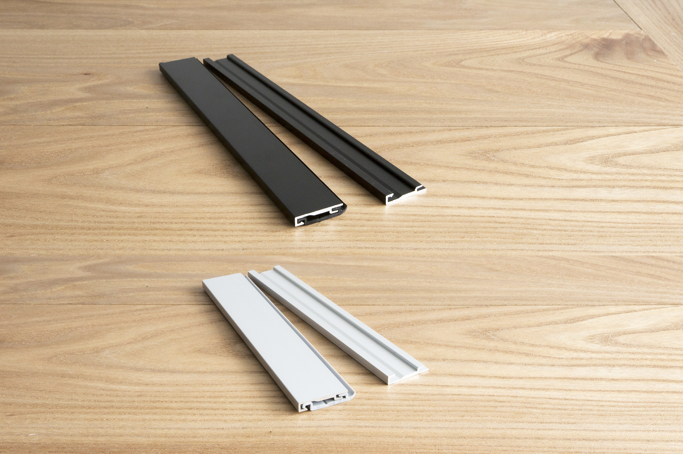 空間を作る基本的な要素である「壁」を守るものが「巾木」。既成の巾木は壁を保護するという役目を果たしていましたが、デザイン性という面ではあまり注意を払われていきませんでした。洗練された空間のため、巾木にアルミが持つ研ぎ澄まされた美しさを加え、雰囲気を損ねることなく空間に溶け込むバランスを大切にしました。