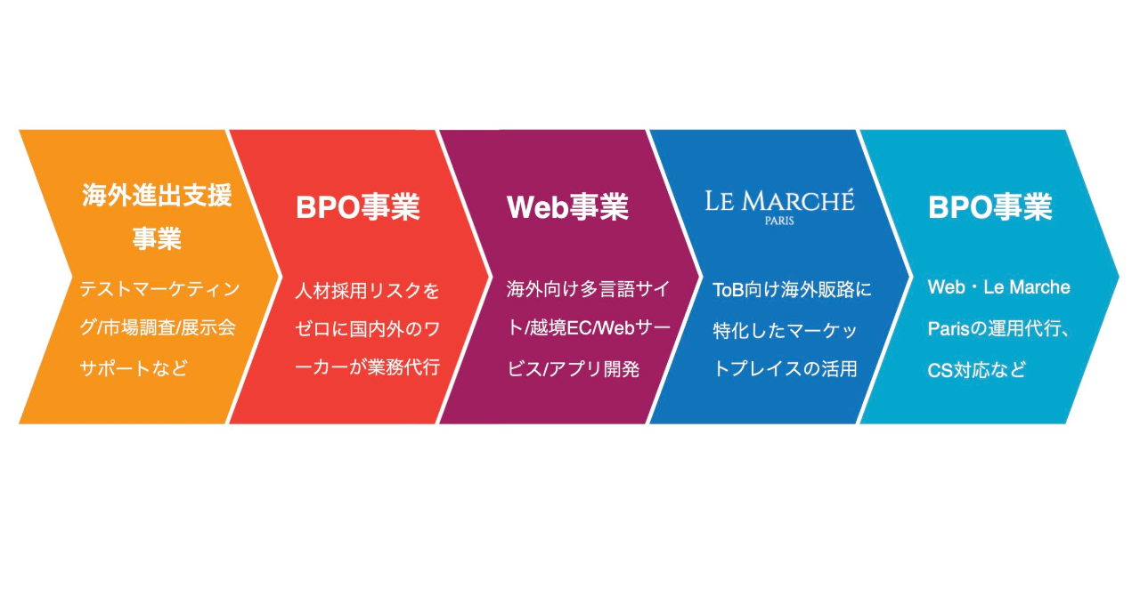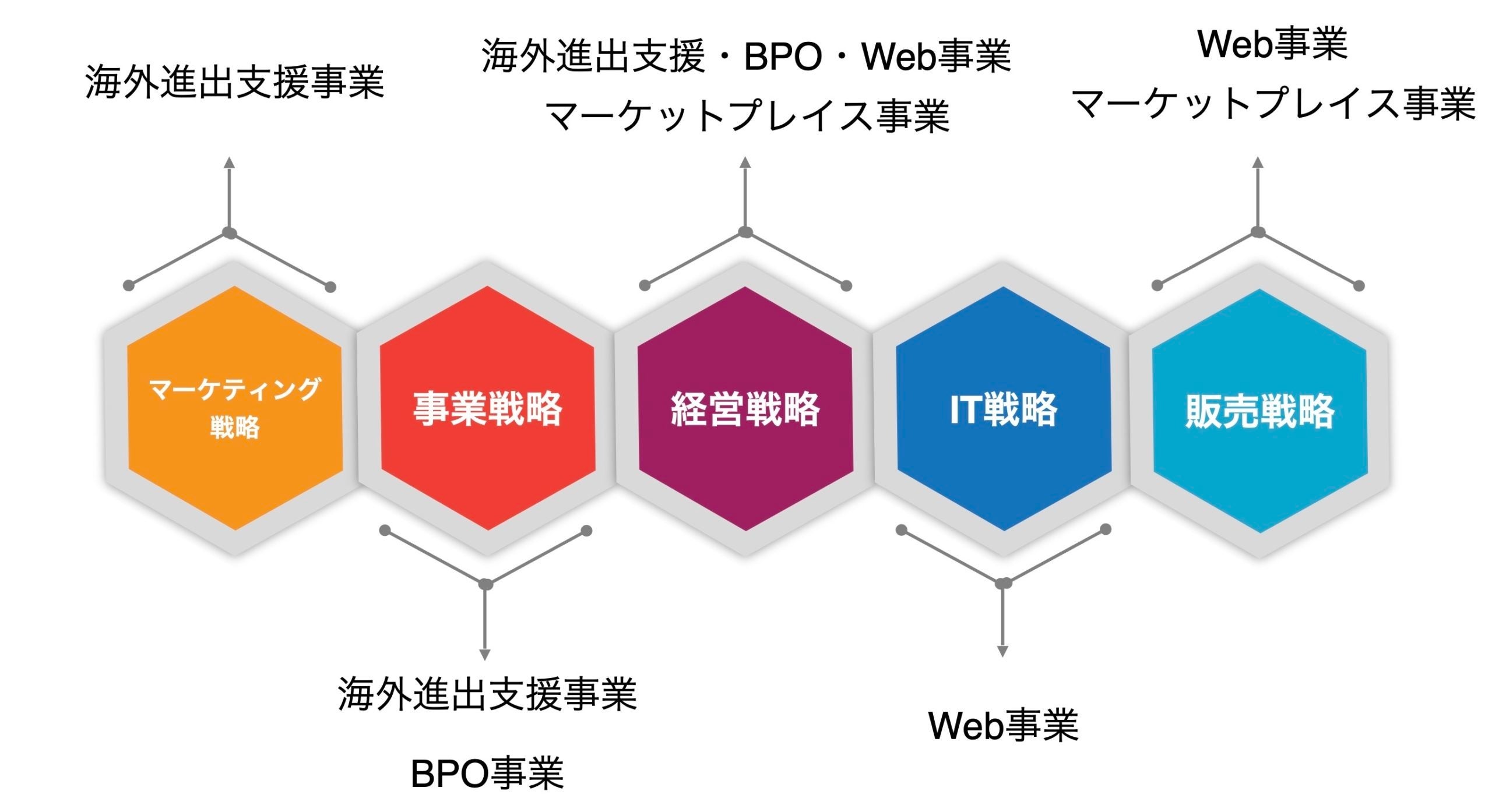 弊社は、マーケットプレイス事業、BPO事業、海外進出支援事業、Web事業が連携し総括的にビジネスサポートします。
