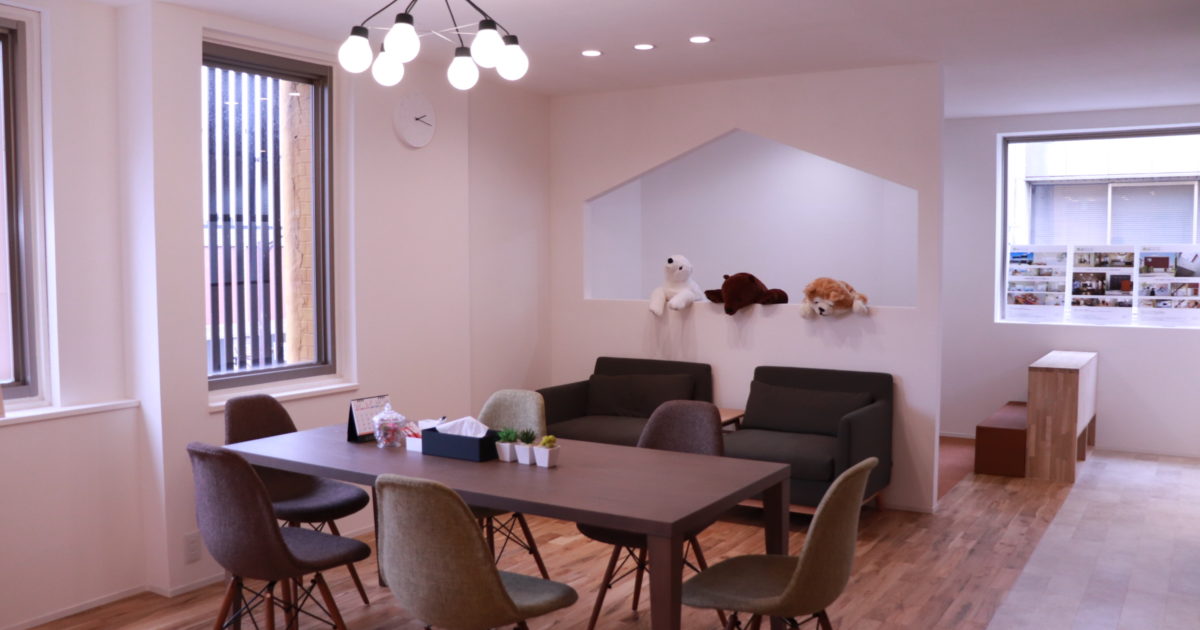 「R+house米子」の店舗は、レトロ感漂うおしゃれな黄色いビルの3F。らせん階段を上った一番奥に位置します。改装計画がデザインしたこだわりの内装は、住宅のように落ち着けて、ワクワクする空間を目指します。