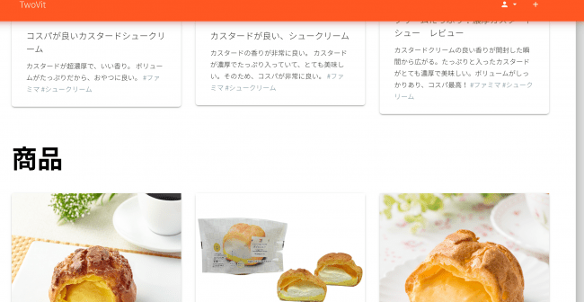 #シュークリームをクリックした場合、シュークリームの関連商品、レビュー、口コミが表示されます。