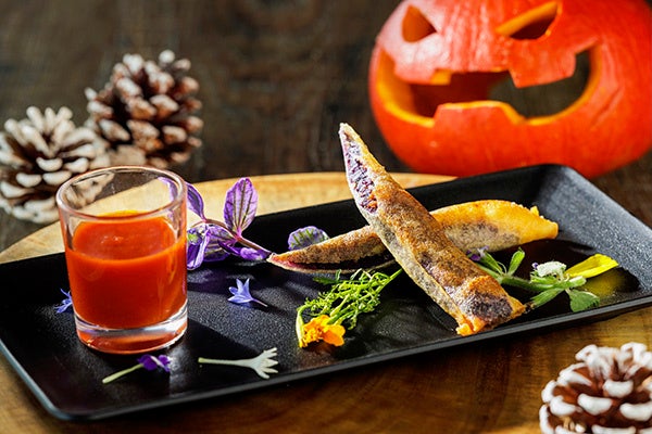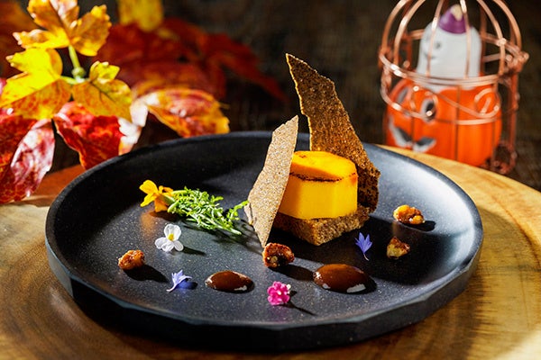 カスケイド ダイニング&ラウンジシェフ 坂野 雄次は「今回のセイボリーはテーマを『大人のハロウィン』とし、フランス料理のアミューズを意識して作成しました。紫やブラッドカラーでハロウィン色を表現しております」と述べています。
