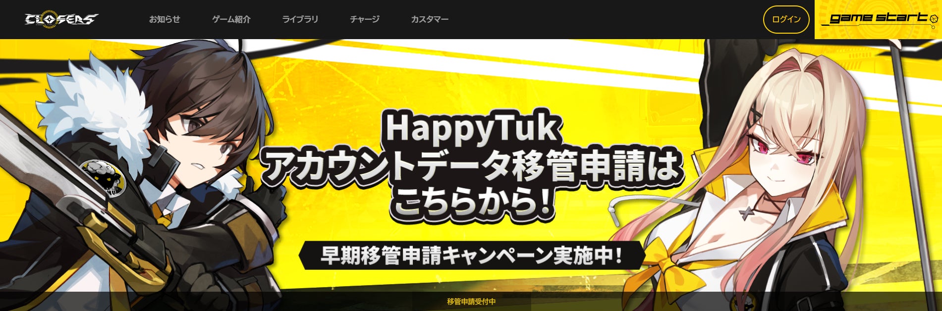 株式会社HappyTuk (以下、当社) は、昨年12月に株式会社NADDIC JAPANより運営サービスの移管を行い、再び当社にて運営を開始した新世代サイキックアクションRPG 『CLOSERS』にて、本日、6月12日(木)にHappyTuk IDへのアカウントデータの移管を実施いたしました。