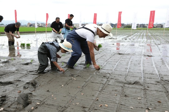 挨拶を終えた海老蔵さんと勸玄さん、花角知事は新潟米「新之助」が実際に植えられる田んぼにて田植えに参加。