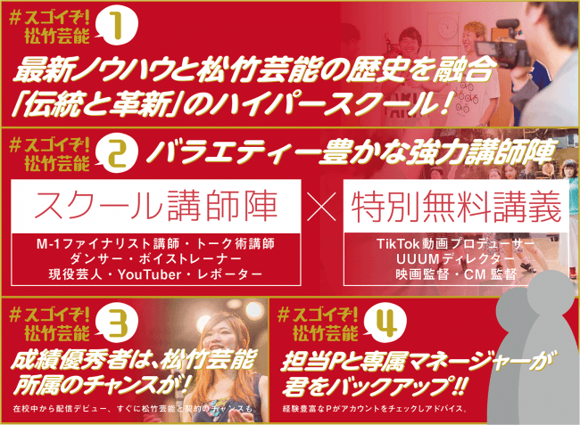 - 実施概要詳細、応募については、松竹芸能タレントスクールホームページ内でご確認ください。