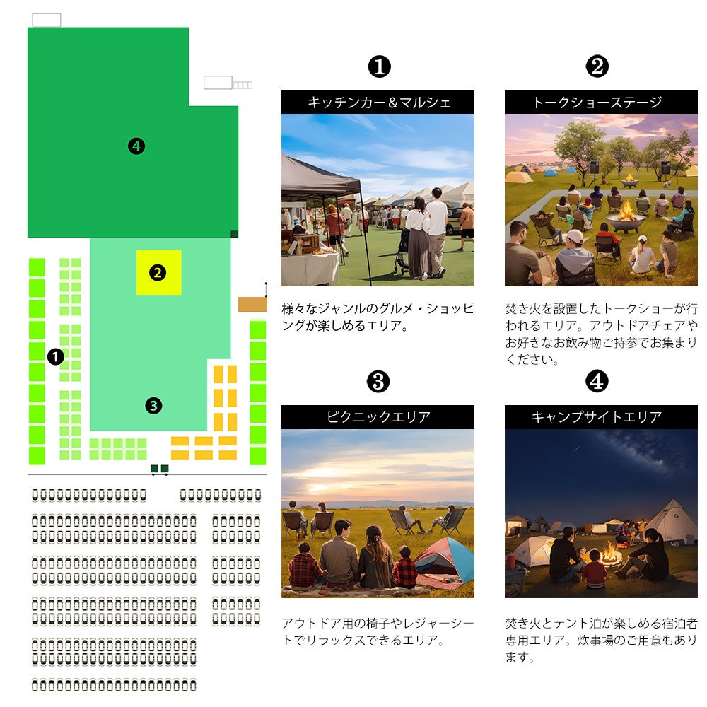 テント泊、焚き火、マルシェ、キッチンカー、ワークショップなど、家族で楽しめる内容に加え、