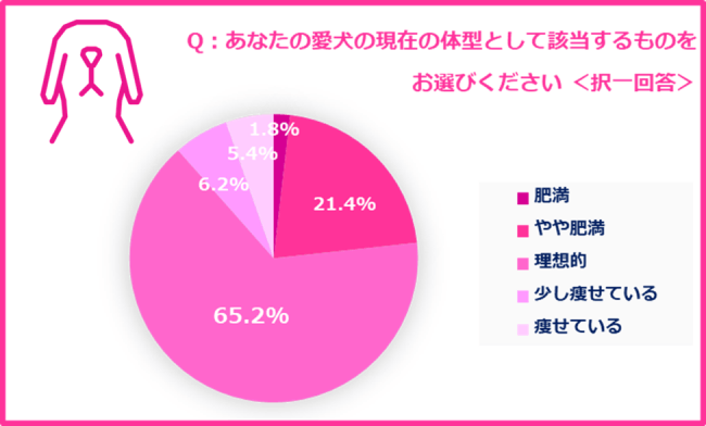 自身と愛犬の健康管理の状況に続き、現在の体型についてもそれぞれ自己評価をしてもらいました。飼い主自身の体型では、「肥満」が41.8%と最多、「理想的な体型」が38.0%、「痩せている」は20.2%に留まっています。これに対して愛犬の体型では、全体の67.8%が「理想的な体型」と回答、「肥満」は24.8%、「痩せている」は8.2%という結果となりました。この結果は属性別に比較しても大差なく、飼い主自身よりも愛犬の体型に自信を持っている状況が浮き彫りとなりました。