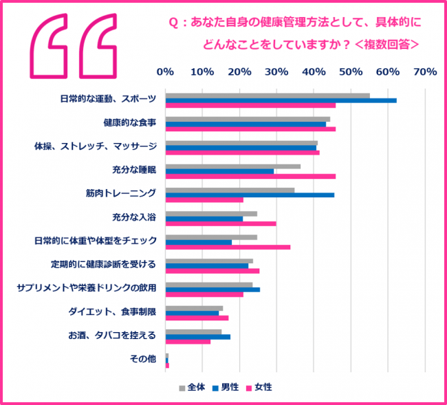 この結果を男女別で比較してみると、飼い主自身の健康管理において、男性は「運動」や「トレーニング」を重視し、女性は「運動」と同等レベルで「食事」と「睡眠」を重視しています。愛犬の健康管理において、「散歩」と「食事」以外の要素では、男性は「散歩以外の運動」を、女性は「愛犬とのスキンシップ」を重視しているなど、男女間での意識の差が浮き彫りとなりました。